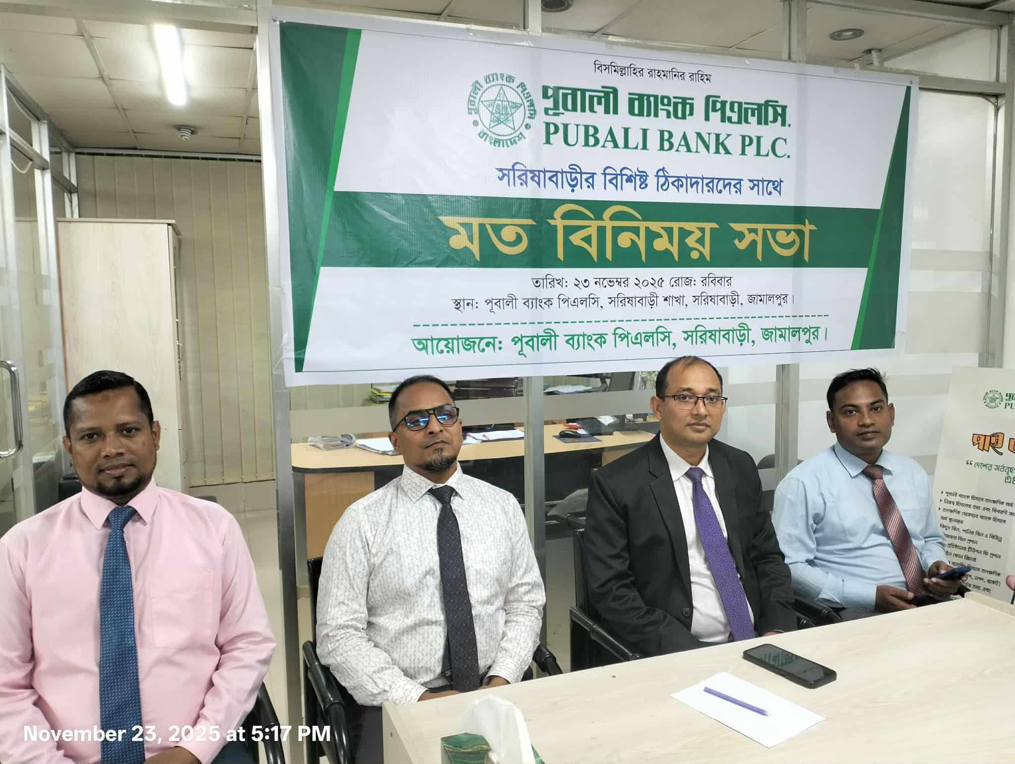 আজ রোববার ২৩(নভেম্বর)২৫ ইং বিকেলে পূবালী ব্যাংক সরিষাবাড়ী শাখার উদ্যোগে বিশিষ্ট ঠিকাদারদের সাথে এ মতবিনিময় সভা অনুষ্ঠিত হয় ।