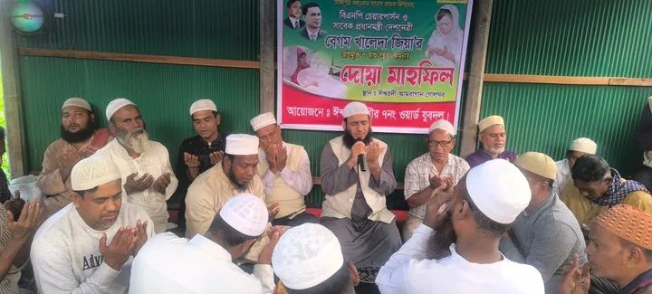 পাবনার ঈশ্বরদীতে বাংলাদেশ জাতীয়তাবাদী দল বিএনপির চেয়ারপার্সন, তিনবারের সাবেক প্রধানমন্ত্রী, আপোষহীন নেত্রী, গণতন্ত্রের মা-দেশনেত্রী বেগম খালেদা জিয়া'র আশু রোগমুক্তি কামনায় দোয়া মাহফিল অনুষ্ঠিত হয়েছে। আজ বৃহস্পতিবার (২৭নভেম্বর) বিকাল ৫টার দিকে ঈশ্বরদী পৌর শহরের ৭নং ওয়ার্ড আমবাগান এলাকায় যুবদলের গোলঘর অফিসে এই দোয়া মাহফিলের আয়োজন করা হয়েছে। উক্ত দোয়া মাহফিলে উপস্থিত ছিলেন, জেলা যুবদলের সাবেক সদস্য ও পৌর যুবদলের যুগ্ম আহ্বায়ক আতিকুর রহমান তাঁরা, পৌর যুবদলের নেতা ইনামুল হক জসিম শেখ, পৌর যুবদলের নেতা মনির শেখ, যুবদল নেতা জুয়েল সরদার, পৌর বিএনপির নেতা সাজ্জাদ হোসেন দুলাল, বিএনপি নেতা মো. চঞ্চল ব্যাপারী, যুবদল নেতা মো. সুমন হোসেন, যুবদল নেতা মো. রাজীব শেখ, মো. সোহেল রানা, মো. সুমন পরামানিক, যুবদল নেতা মো. শরিফ মোল্লা, মো. মুশফিকুর রহমান মিশনসহ আরও অনেকে এ সময় উপস্থিত ছিলেন।