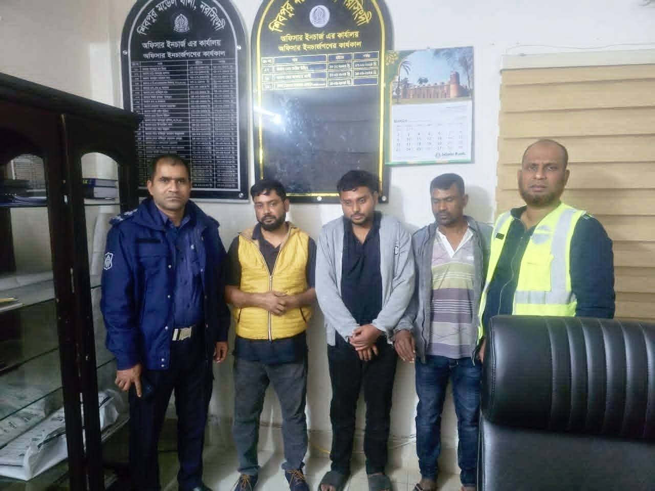 এরপর তারা কোন কিছু বুঝার আগেই অস্ত্রের মুখে জিম্মি করে তাদের হাত পা বেধে প্রাইভেটকার উঠিয়ে পুরানন্দিয়া বাসস্ট্যান্ডের পাশে ফেলে যায়। অপরদিকে গরুর ট্রাক নিয়ে পালিয়ে যায় ডাকাত দল। হাত-পা বাঁধা ব্যক্তিদের ডাক চিৎকার শুনতে পান টহল পুলিশ। তাৎক্ষণিক পুলিশ তাদেরকে উদ্ধার করে অভিযানে বের হয়ে কামার টেক বাসস্ট্যান্ডে গিয়ে ট্রাক ভর্তি গরুসহ ৩ ডাকাত আটক করতে সক্ষম হন শিবপুর মডেল থানার পুলিশ ।আটক কৃত ডাকাতরা হলো , ১/ দক্ষিণ খান থানার কসাই বাজার এলাকার মোহাম্মদ আলীর ছেলে আলমগীর (২৫), ২/চৌহালী থানার কুমারপুর গ্রামের ওহাব আলীর ছেলে, কুতরত আলী (৩৫), ৩/ শরিয়তপুর জেলার জাজিরা থানার দুদু মিয়ার ছেলে ইব্রাহিম (৩৮)। দুপুরে খবর পেয়ে শিবপুর থানায় আসেন এগ্রো ফার্ম এর ম্যানেজার মাহাদি উজ্জামান মেহেদী। তিনি বাদী হয়ে শিবপুর থানায় মামলা দায়ের করেন, মামলার নং ১৩ তারিখ ১৪/১২/২০২৫ ইং।