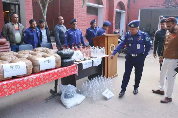পুলিশ জানায়, অভিযানে ১৬ লিটার ৬০০ মিলিলিটার দেশীয় বাংলা মদ, ৭০ কেজি গাঁজা, ৪৫টি খালি বোতল, ৬৬০টি কর্ক, একটি মোবাইল ফোন এবং মাদক বিক্রির নগদ ১ লাখ ৮ হাজার ৯০ টাকা জব্দ করা হয়।