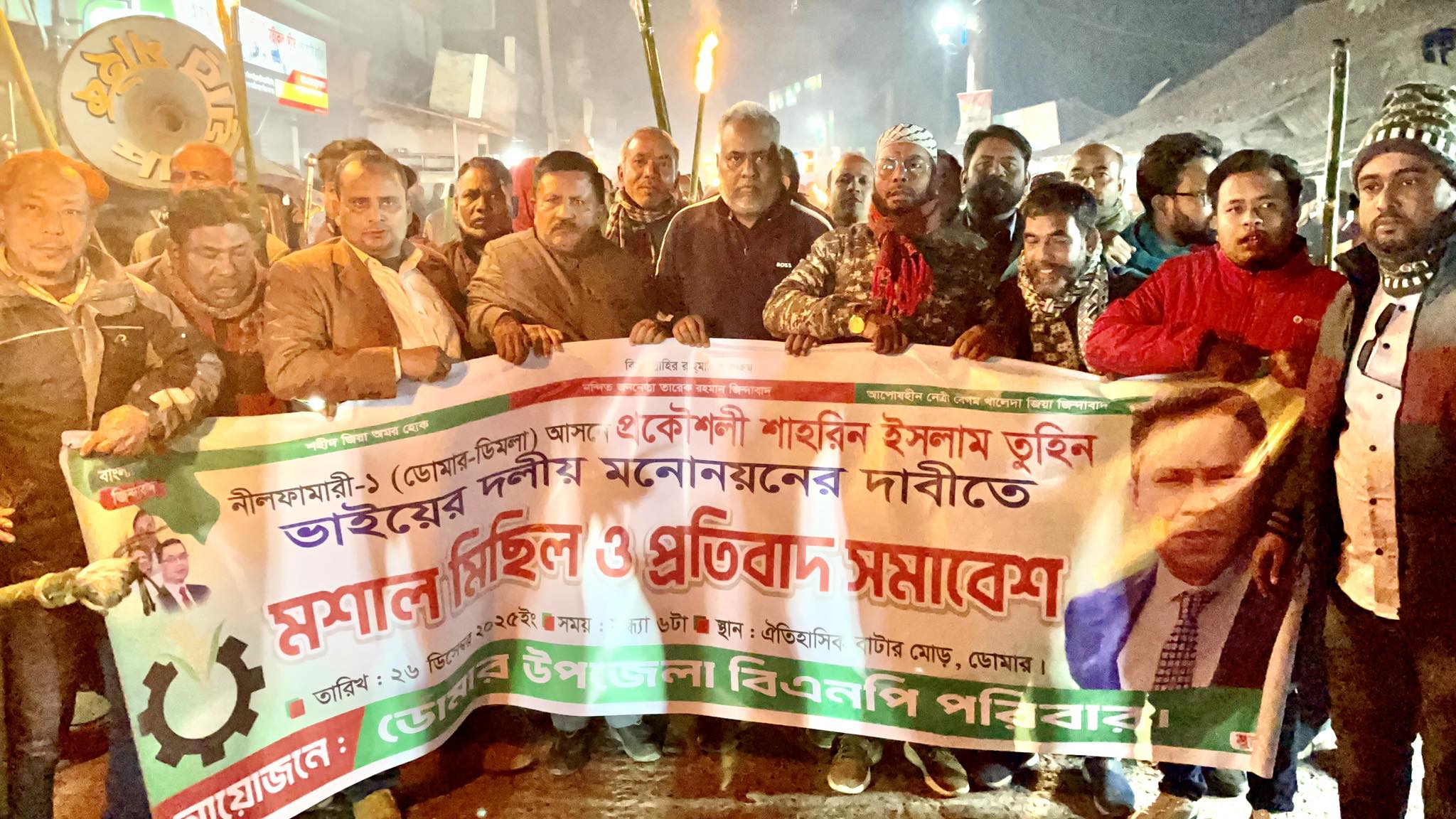 নীলফামারী-১ (ডোমার-ডিমলা) সংসদীয় আসনে বাংলাদেশ জাতীয়তাবাদী দল (বিএনপি)-এর দলীয় মনোনয়ন প্রকৌশলী শাহরিন ইসলাম চৌধুরী তুহিনের দাবিতে মশাল মিছিল ও প্রতিবাদ সমাবেশ করেছে ডোমার উপজেলা বিএনপি পরিবার।