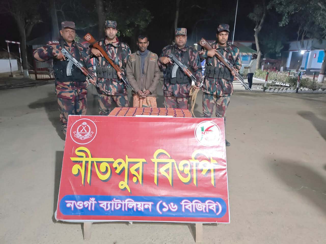 নওগাঁ ব্যাটালিয়ন (১৬ বিজিবি) কর্তৃক নওগাঁ জেলার পোরশা উপজেলার নিতপুর সীমান্তে ০১ জন চোরাকারবারীসহ বিপুল পরিমাণ ভারতীয় ট্যাপেন্টাডল ট্যাবলেট আটক করেছেন বিজিবি, ৫ জানুয়ারি আনুমানিক রাত ৯টার সময়। নওগাঁ জেলার পোরশা থানার অন্তর্গত অত্র ব্যাটালিয়নের অধীনস্থ নীতপুর বিওপির টহল কমান্ডার সুবেদার মোঃ মাহফুজুর রহমান এর নেতৃত্বে একটি বিশেষ টহল দল বটতলী রাঙ্গাপুকুর নামক স্থানে অভিযান পরিচালনা করে ১০৮০ পিস ভারতীয় ট্যাপেন্টাডল ট্যাবলেট, মোবাইল ০১ টি এবং ০২ টি সীম কার্ডসহ ০১ জন চোরাকারবারী মোঃ ইসরাফিল (২৪), পিতা-মোঃ বজলুর রহমান, গ্রাম-রাঙ্গাপুকুর, পোস্ট-কালাইবাড়ি, থানা-পোরশা, জেলা-নওগাঁ’কে আটক করতে সক্ষম হয়। আটককৃত আসামীর বিরুদ্ধে নওগাঁ জেলার পোরশা থানায় মামলা দায়ের পূর্বক মাদকদ্রব্য এবং অন্যান্য মালামালসহ পুলিশের নিকট হস্তান্তর করার কার্যক্রম প্রক্রিয়াধীন রয়েছে।