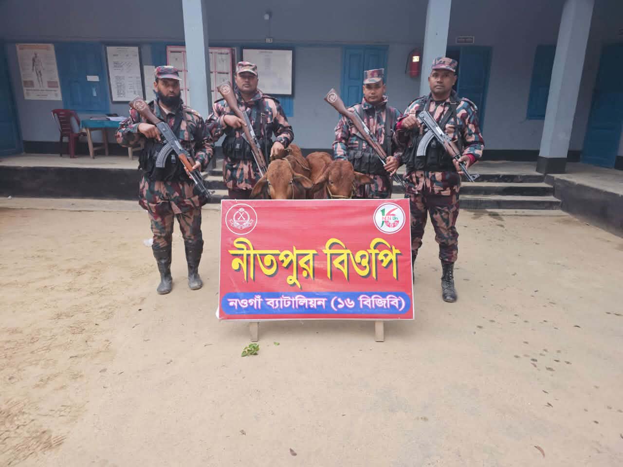 নওগাঁ ব্যাটালিয়ন (১৬ বিজিবি) কর্তৃক নওগাঁ সীমান্তে মালিকবিহীন অবস্থায় ভারতীয় গরু আটক করেন। ৬ জানুয়ারি মঙ্গলবার ভোর আনুমানিক ৪.৩০ মিনিটে নওগাঁ জেলার পোরশা থানার অন্তর্গত অত্র ব্যাটালিয়নের অধীনস্থ নীতপুর বিওপির টহল কমান্ডার হাবিলদার মোঃ নজরুল ইসলাম এর নেতৃত্বে একটি বিশেষ টহল দল টেট্রা নামক স্থানে অভিযান পরিচালনা করে মালিকবিহীন অবস্থায় ০২টি ভারতীয় গরু আটক করতে সক্ষম হয়। আটককৃত ভারতীয় গরু ০২টি পত্নীতলা শুল্ক কার্যালয়ে জমা করার কার্যক্রম প্রক্রিয়াধীন রয়েছে। নওগাঁ ও চাঁপাইনবাবগঞ্জ সীমান্তে গরু/মাদক পাচার/অবৈধ সীমান্ত পারাপার এবং চোরাচালানের বিরুদ্ধে সর্বাত্বক অভিযান অব্যাহত রাখার অঙ্গিকার ব্যক্ত করেছেন মেজর তানিম হাসান খান, এসপিপি, পিএসসি, অতিরিক্ত পরিচালক, ভারপ্রাপ্ত অধিনায়ক নওগাঁ ব্যাটালিয়ন (১৬ বিজিবি)।