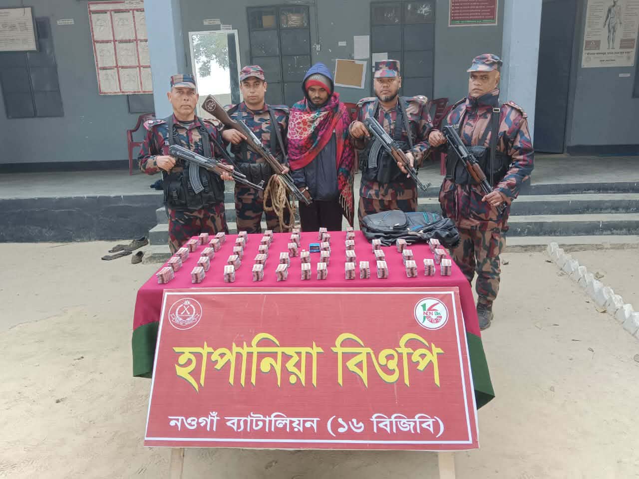 নওগাঁ ব্যাটালিয়ন (১৬ বিজিবি) কর্তৃক নওগাঁ সীমান্তে ০১ জন চোরাকারবারীসহ বিপুল পরিমাণ ভারতীয় ট্যাপেন্টাডল ট্যাবলেট আটক করেন।১২ জানুয়ারি আনুমানিক সোমবার সকাল ৬ টার নওগাঁ জেলার সাপাহার থানার অন্তর্গত অত্র ব্যাটালিয়নের অধীনস্থ হাপানিয়া বিওপির টহল কমান্ডার নায়েব সুবেদার মোহাম্মদ আলী এর নেতৃত্বে একটি বিশেষ টহল দল কৃষ্ণ সদা নামক স্থানে অভিযান পরিচালনা করে ভারতীয় ট্যাপেন্টাডল ট্যাবলেট ৪৮০০ পিস, মোবাইল ০১টি, ভারতীয় সীম কার্ড ০১টি এবং ব্যাগ ০১টিসহ ০১ জন চোরাকারবারী মোঃ হোসেন আলী(২৮), পিতা-মোঃ লুৎফর রহমান, গ্রাম-হাপানিয়া, পোস্ট-আলাদিপুর, থানা-সাপাহার, জেলা-নওগাঁ’কে আটক করতে সক্ষম হয়। আটককৃত আসামীর বিরুদ্ধে নওগাঁ জেলার সাপাহার থানায় মামলা দায়ের পূর্বক মাদকদ্রব্য এবং অন্যান্য মালামালসহ পুলিশের নিকট হস্তান্তর করার কার্যক্রম প্রক্রিয়াধীন রয়েছে। নওগাঁ ও চাঁপাইনবাবগঞ্জ সীমান্তে গরু/মাদক পাচার/অবৈধ সীমান্ত পারাপার এবং চোরাচালানের বিরুদ্ধে সর্বাত্বক অভিযান অব্যাহত রাখার অঙ্গিকার ব্যক্ত করেছেন মেজর মোঃ শফিকুর রহমান, অতিরিক্ত পরিচালক, ভারপ্রাপ্ত অধিনায়ক নওগাঁ ব্যাটালিয়ন (১৬ বিজিবি)।