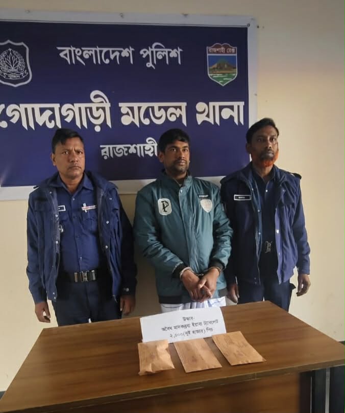 রাজশাহীর গোদাগাড়ী মডেল থানা পুলিশ এক সফল অভিযান চালিয়ে ২,০০০ (দুই হাজার) পিস ইয়াবা ট্যাবলেটসহ মো: সেলিম রেজা (৫৪) নামের এক চিহ্নিত মাদক ব্যবসায়ীকে গ্রেপ্তার করেছে। গত ১২ জানুয়ারি (সোমবার) বিকেলে গোদাগাড়ী পৌরসভার ১নং ওয়ার্ডের গড়ের মাঠ এলাকায় এই অভিযান পরিচালিত হয়।