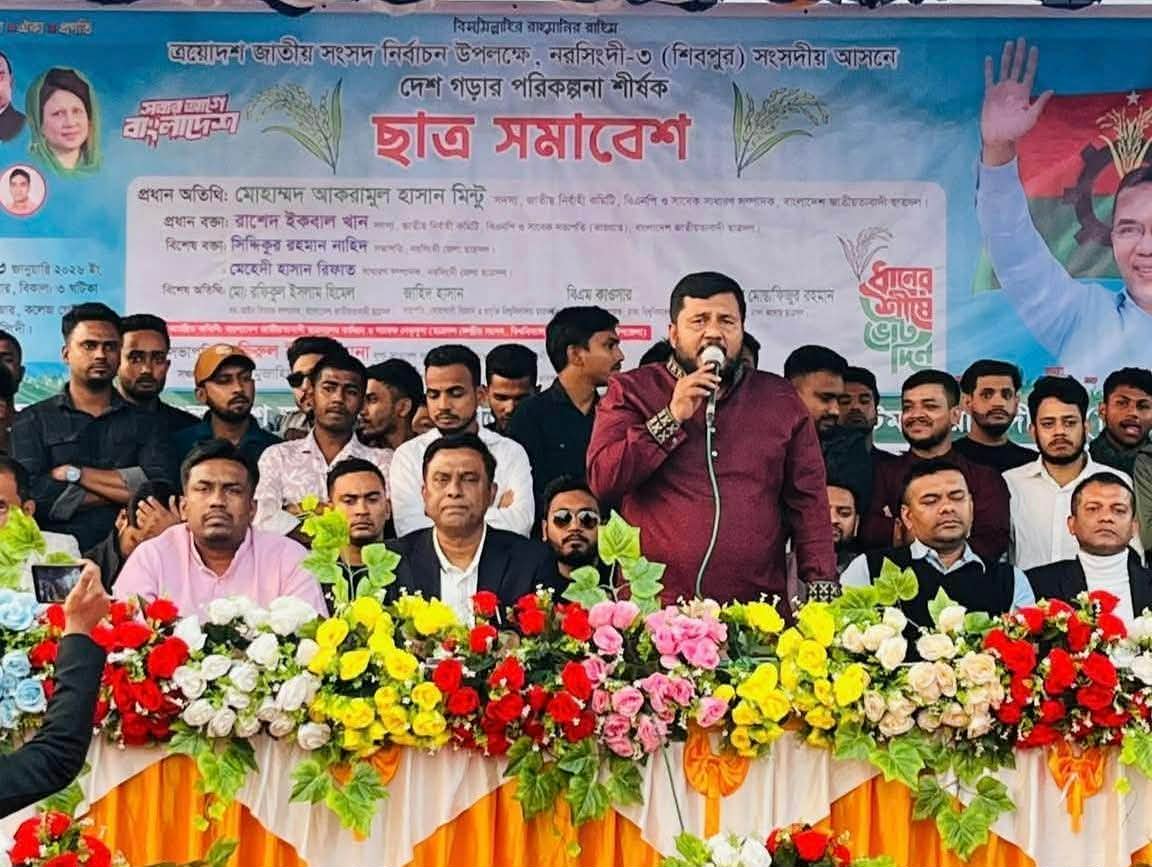 নরসিংদী - তিন শিবপুর আসনে দেশ গড়ার পরিকল্পনা শীর্ষক ছাত্র সমাবেশ অনুষ্ঠিত হয়েছে। ২৬ জানুয়ারি ২০২৬ ইং সোমবার বিকালে শিবপুর বাঁশ বাজার মাঠে বাংলাদেশ জাতীয়তাবাদী ছাত্রদল নরসিংদী তিন শিবপুর আসনে নির্বাচনী প্রচারণা টিমের আয়োজনে এই সমাবেশ অনুষ্ঠিত হয়।
