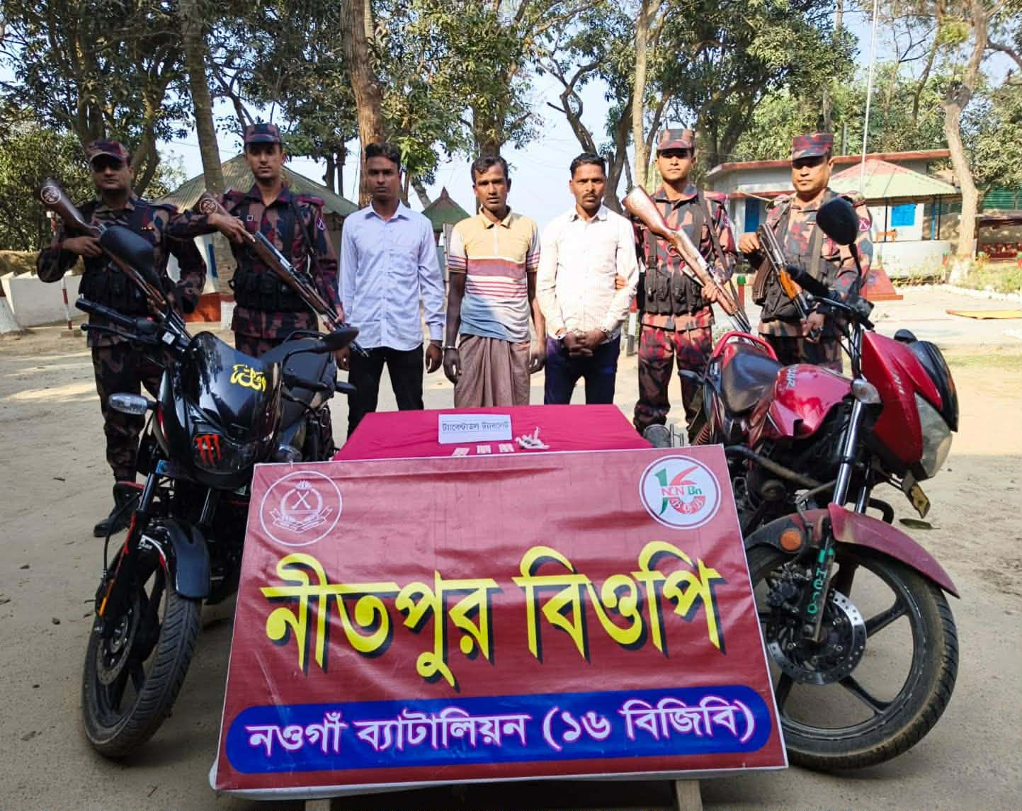 নওগাঁর পোরশায় ভারতীয় ট্যাপেন্টাডাল ট্যাবলেট ও গাজাসহ তিন মাদক ব্যবসায়ীকে আটক করেছে ১৬ বিজিবি নিতপুর বিওপির টহল সদস্যরা। আরআইবি, এসআইপি ও সিভিল সোর্সের দেওয়া সংবাদের ভিত্তিতে বুধবার দপুরে নিতপুর বিওপির সীমান্ত মেইন পিলার ২২৯/১৭ আর হতে আনুমানিক ২ কিলোমিটার বাংলাদেশের অভ্যন্তরে পারঘাটি ব্রীজের উপর থেকে দুইটি মোটরসাইকেল সহ তিনজন মাদক ব্যবসায়ীকে আটক করা হয়। এতে নেতৃত্বদেন হাবিলদার মনিরুল ইসলাম। এসময় তাদের কাছ থেকে ৩০পিস ভারতীয় ট্যাপেন্টাডল ট্যাবলেট, ৪ পুরিয়া গাজা, একটি পালসার মোটরসাইকেল ও একটি হিরো গ্লামার মোটরসাইকেল উদ্ধার করা হয়। আটককৃতরা হলেন, নিতপুর গ্রামের আতাবুরের ছেলে সুমন বালাশহিদ গ্রামের শফিকুল ইসলামের ছেলে ইনতাজুল ও গোপিনাথপুর গ্রামের ইজাজুলের ছেলে কাফি এব্যাপারে পোরশা থানায় একটি মামলা হয়েছে এবং আটকৃতদের থানায় হস্তান্তর করা হয়েছে। বিষয়টি নিশ্চিত করেছেন ১৬বিজিবি নিতপুর বিওপির কোম্পানী কমান্ডার নায়েব সুবেদার আবু তালেব।