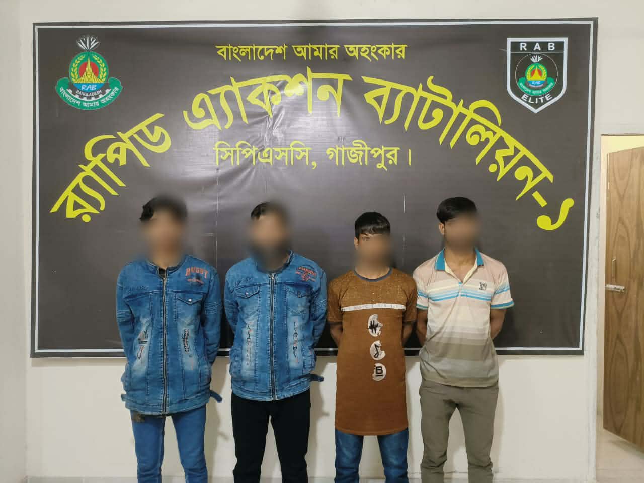 র্যাব জানায়, গোপন সংবাদের ভিত্তিতে র্যাব-৫ (সিপিএসসি) এবং র্যাব-১ (সিপিএসসি)-এর একটি চৌকস দল তথ্যপ্রযুক্তির সহায়তায় গাজীপুরে আসামিদের অবস্থান শনাক্ত করে। এরপর মধ্যরাতে অভিযান চালিয়ে চারজনকে গ্রেপ্তার করতে সক্ষম হয়।