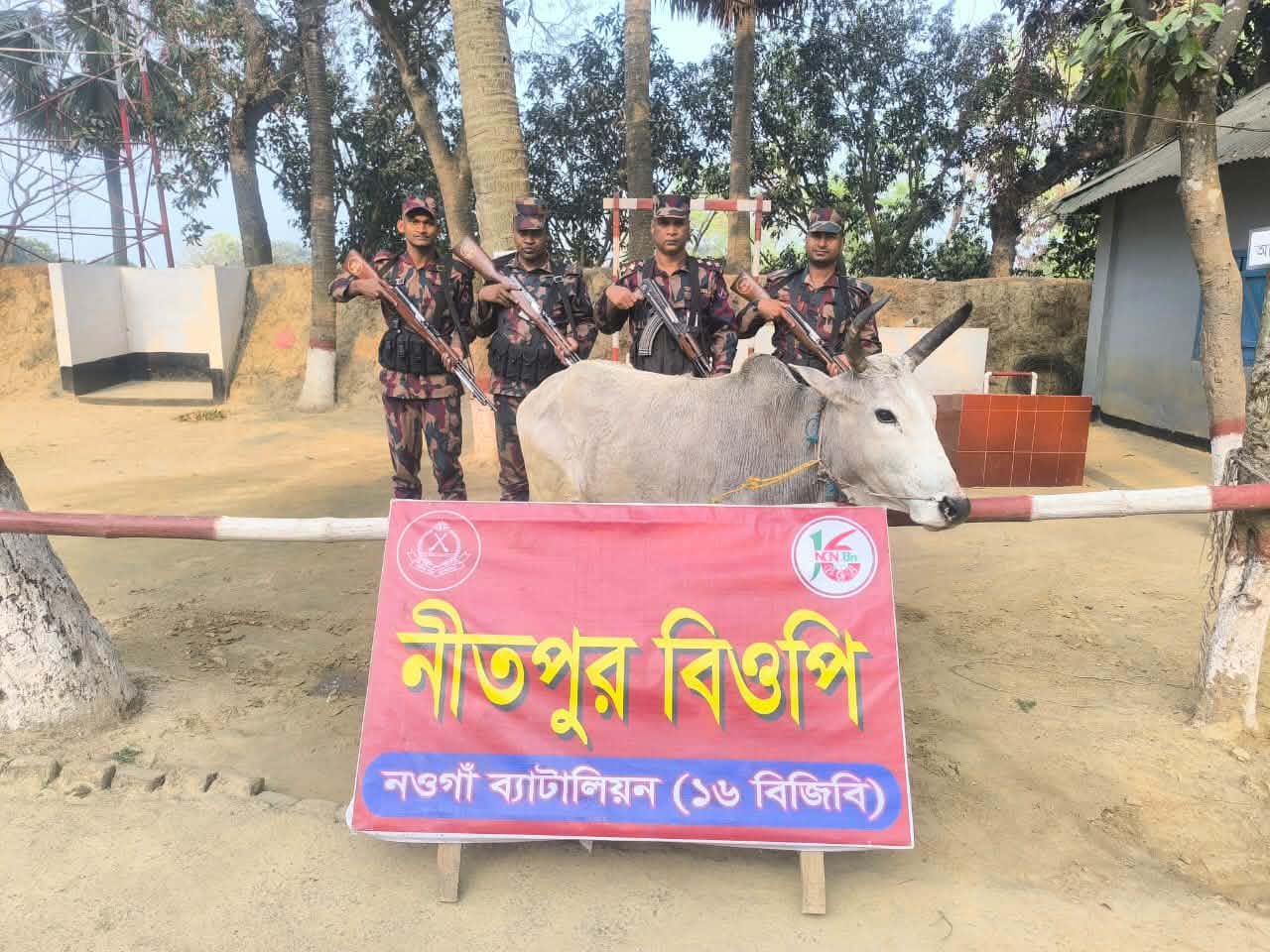 নওগাঁ ব্যাটালিয়ন (১৬ বিজিবি) কর্তৃক নওগাঁ সীমান্তে মালিকবিহীন অবস্থায় ভারতীয় গরু আটক করেন। শুক্রবার৬ মার্চ ২০২৬ তারিখ আনুমানিক ভোর ৩ টার সময় নওগাঁ জেলার পোরশা থানার অন্তর্গত অত্র ব্যাটালিয়নের অধীনস্থ নীতপুর বিওপির টহল কমান্ডার সুবেদার সেখ আব্দুল জব্বার এর নেতৃত্বে একটি বিশেষ টহল দল পশ্চিম রঘুনাথপুর নদীর পাশে অভিযান পরিচালনা করে মালিকবিহীন অবস্থায় ০১টি ভারতীয় গরু আটক করতে সক্ষম হয়। আটককৃত ভারতীয় গরুটি নজিরপুর শুল্ক কার্যালয়ে জমা করার কার্যক্রম প্রক্রিয়াধীন রয়েছে।