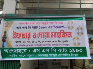 জামালপুর সদর উপজেলার দিগপাইত ইউনিয়নের দিগপাইত ধরণী কান্ত বহুমুখী উ”চ বিদ্যালয়ের এসএসসি-৯৩ ব্যাচের বন্ধুদের আয়োজনে ইফতার পার্টি গত ১৮ মার্চ বুধবার অনুষ্ঠিত হয়েছে। ব্যাচমেট আলহাজ মোত্তালিব হোসেন বিপুলের সার্বিক
