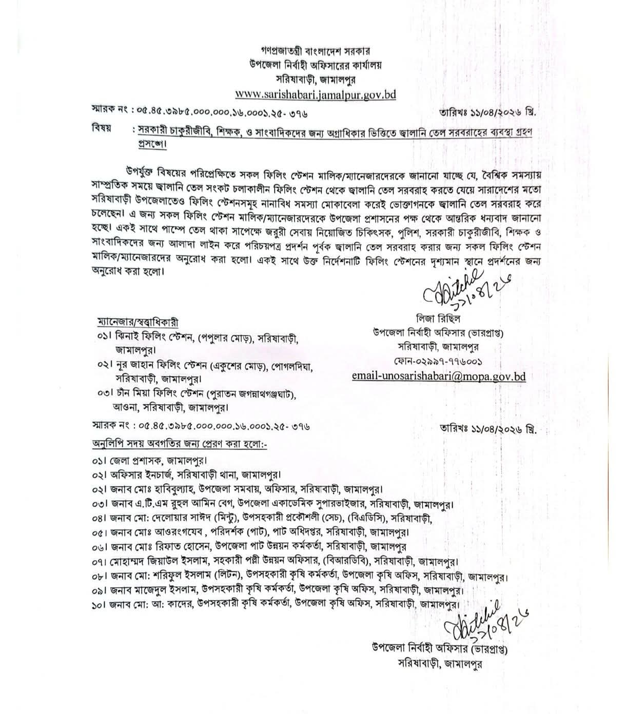 জামালপুরের সরিষাবাড়ীতে সরকারি চাকরিজীবী, চিকিৎসক, শিক্ষক ও সাংবাদিকদের জন্য অগ্রাধিকার ভিত্তিতে জ্বালানি তেল সরবরাহের নির্দেশনা দিয়েছেন উপজেলা প্রশাসন। উপজেলা নির্বাহী কর্মকর্তার কার্যালয় থেকে জারি করা এক চিঠিতে এ নির্দেশনা দেওয়া হয়।